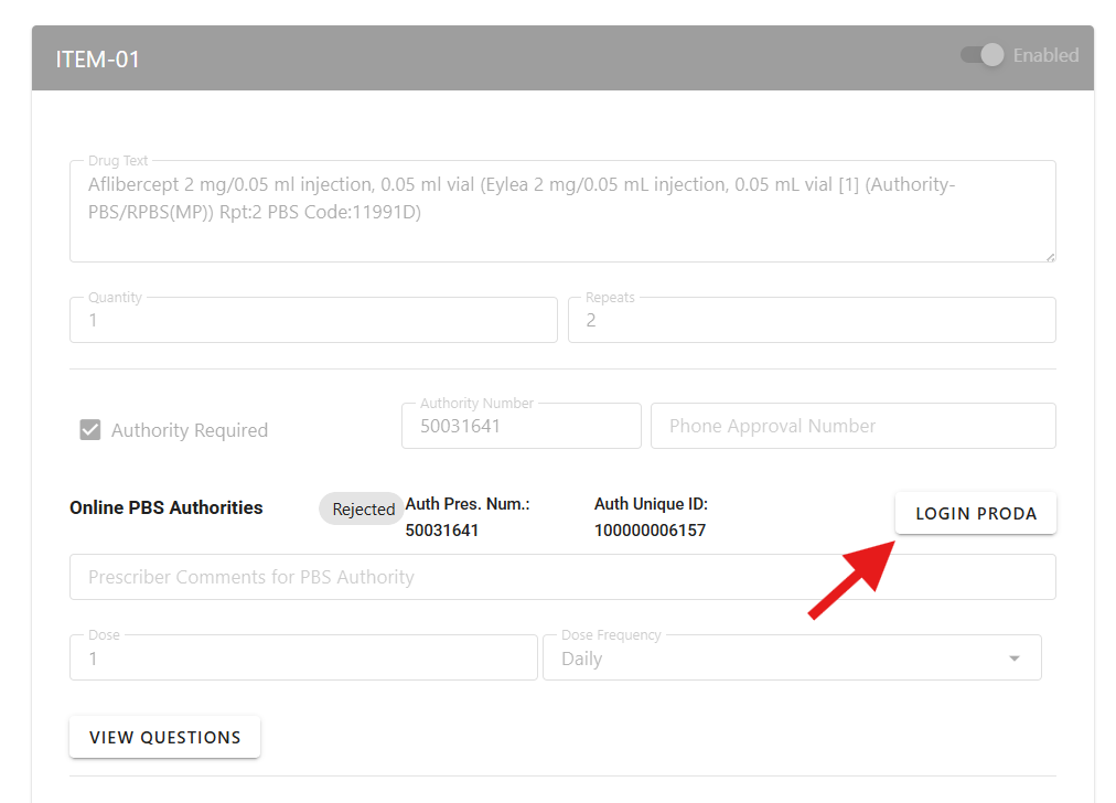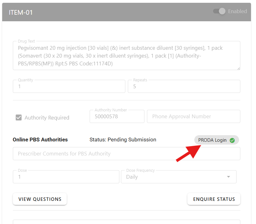 In the Prescription page, click on the “Login PRODA” button to start the login process. However, if an existing PRODA Login session is still valid, the button will be replaced by a green check mark.