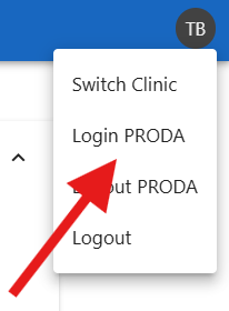 From the user action button, click on “Login PRODA” pop up menu item