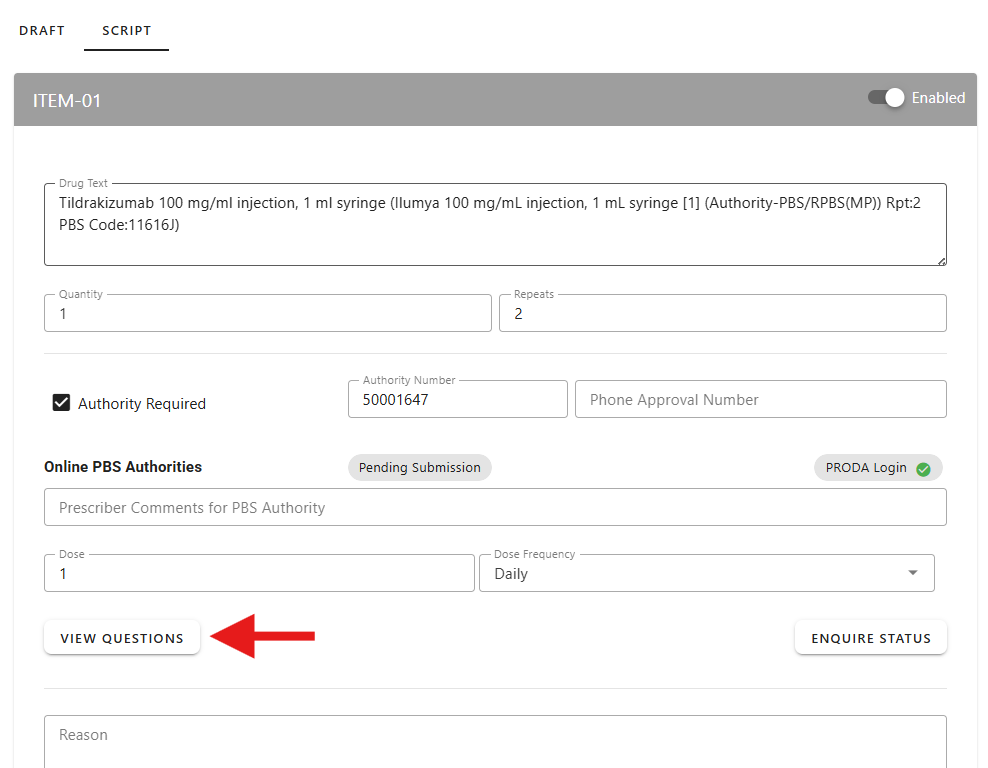 After selecting the appropriate Restriction Code for PBS drug, click on “View Questions” in the “Script” tab to obtain relevant questions.
